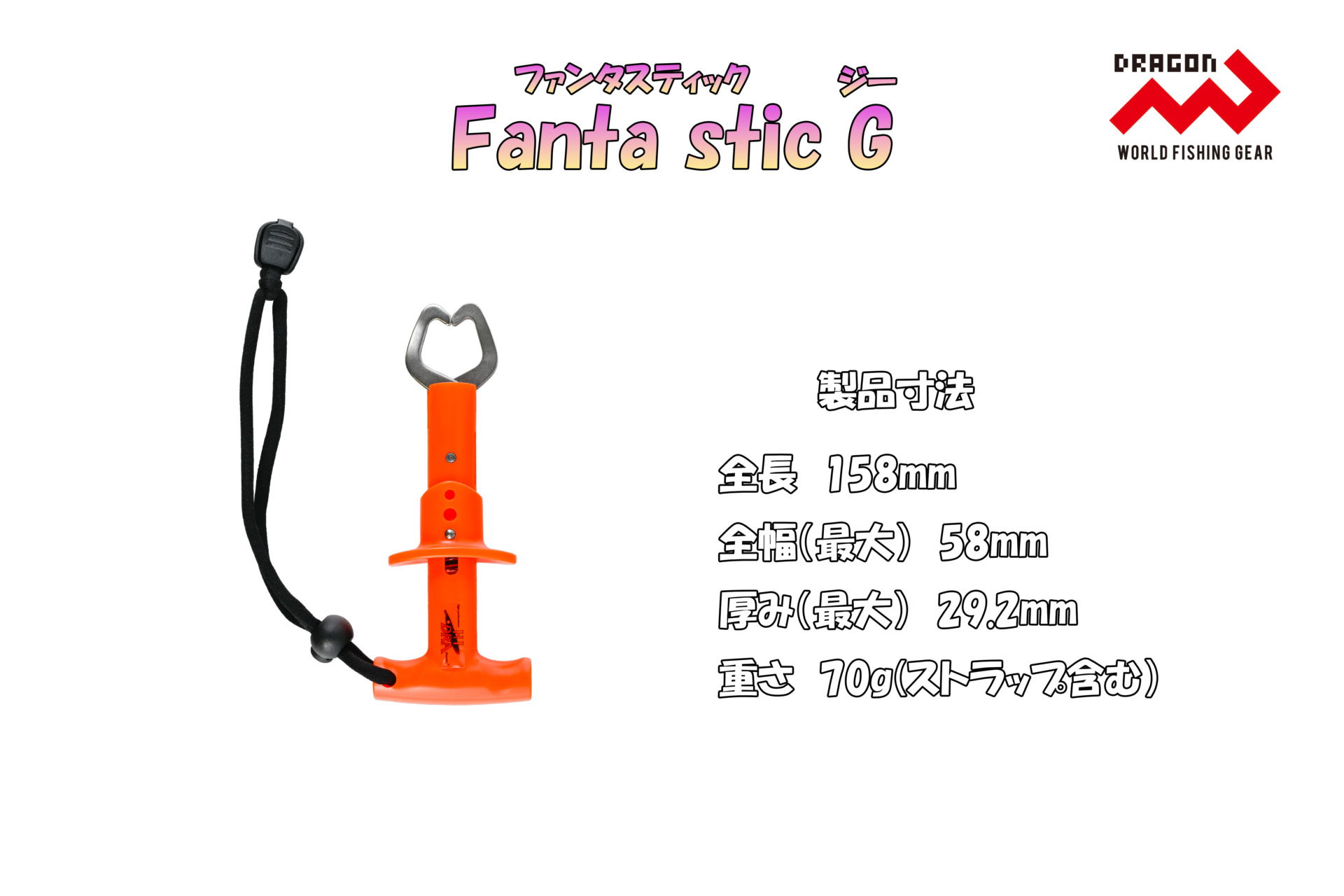Fanta stic G (ファンタスティック G ) グッズ便利グッズ おすすめ人気 手軽に!楽しく!!フィッシュグリップをすべての釣り人に!! 必要十分な機能と性能を備えながら、だれでも手に出来る低価格を実現しました。 釣りを始めたばかりの少年少女アングラーから、コンパクトさを求めたベテランアングラーまで!! カラーは鮮やかな、「蛍光イエロー」「蛍光オレンジ」「ライトブルー」の3色をラインナップ! ◯パッケージ寸法※本製品はパッケージ無しです。本体に製品タグを取り付けております。◯小箱入数 100JANコード商品名規格4535090148012Fanta stic G蛍光オレンジ4535090148029Fanta stic G蛍光イエロー4535090148036Fanta stic Gライトブルー