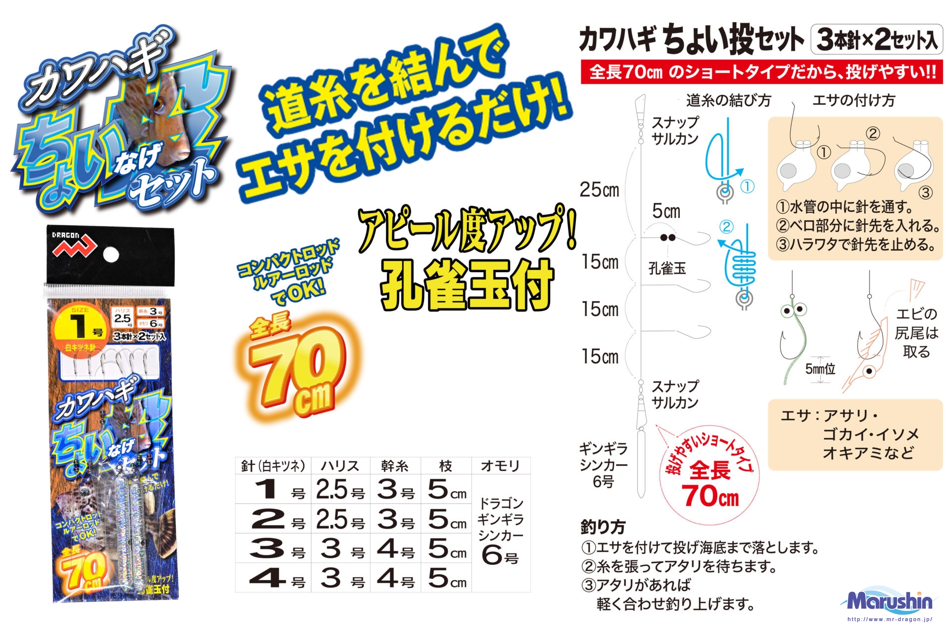 カワハギちょい投げセット 1号~4号 海釣り仕掛 おすすめ人気 道糸を結んでエサを付けるだけ!! コンパクトロッドやルアーロッドでも使える全長70㎝ ギンギラシンカー付きでかんたん! すぐに釣り場へ直行できます!! ※小箱入数:50個JANコード商品名規格4535090170846カワハギちょい投セット1号4535090170853カワハギちょい投セット2号4535090170860カワハギちょい投セット3号4535090170877カワハギちょい投セット4号