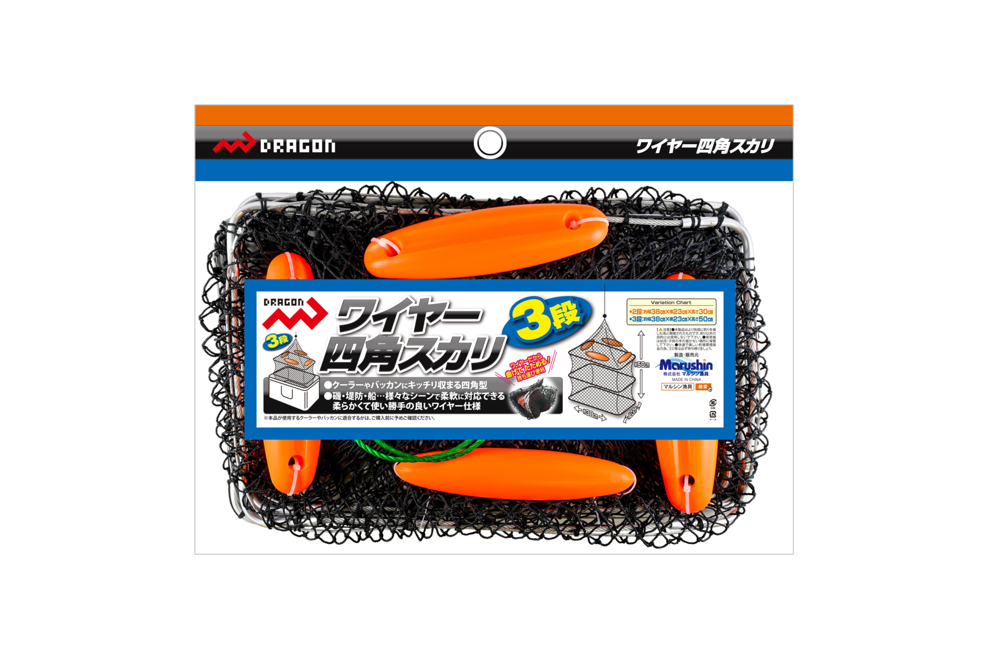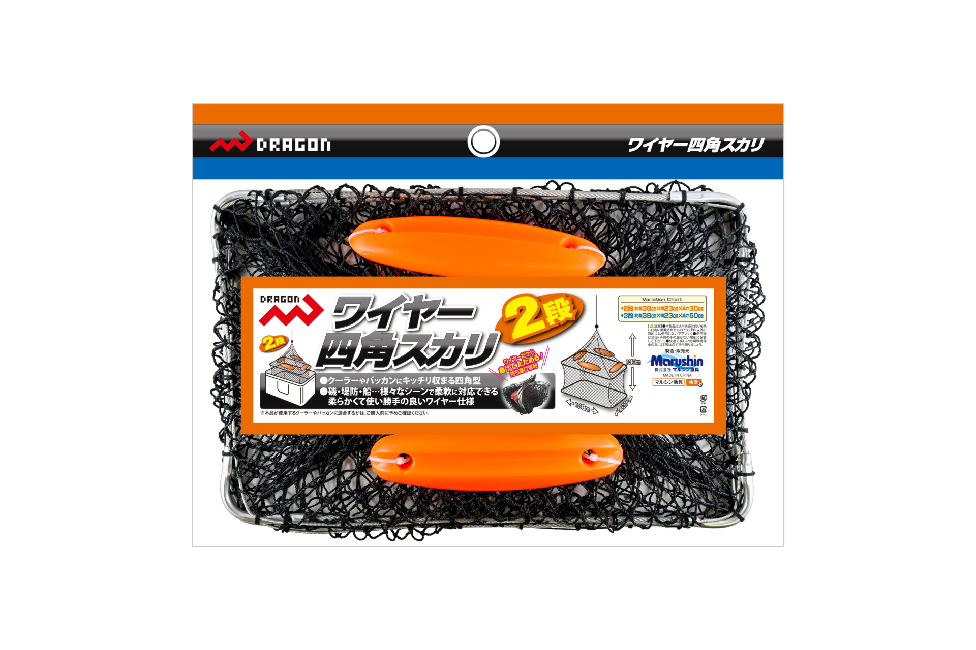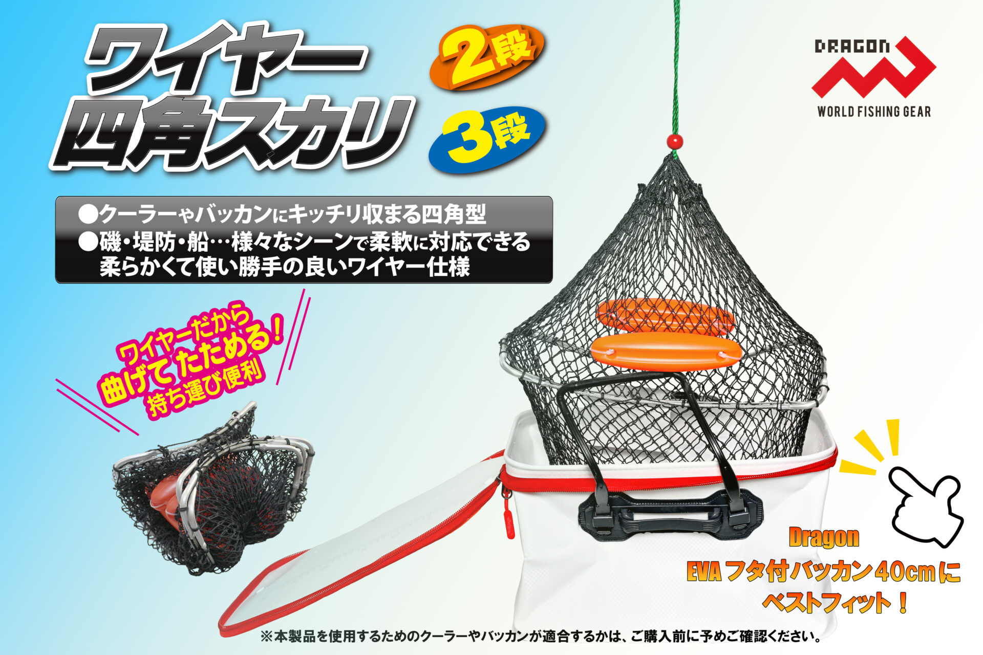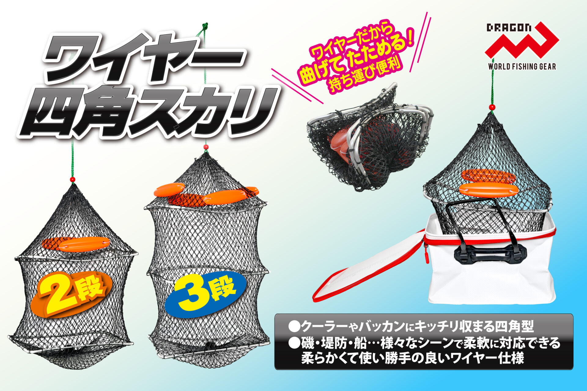 ワイヤー四角スカリ / 2段・3段 海釣り網類・スカリ NEW!! おすすめ ”曲げてたたんで持ち運びに超便利!!” クーラーやバッカンにキッチリ収まる四角型、 Dragon【ワイヤー四角スカリ】 ワイヤーだから曲げてたためて超便利と人気のDragon『ワイヤーラバーネットスカリ』や、 『ワイヤースカリ40』はともに丸型。 ”クーラーやバッカンにキッチリと収まる四角型を!” そんな釣りファンのご要望にお答えして、【ワイヤー四角スカリ 2段・3段】が発売となり ました。 柔らかくて使い勝手の良いワイヤー仕様、Dragon【ワイヤー四角スカリ】は、全国の釣具 販売店様でご購入いただけます。 納期や販売価格のお問い合わせ、ご購入は「いつものお店」でお願いいたします。 ◯パッケージ寸法(約) 2段 W43.0cm D32.5cn H3.9cm GROSS WEIGHT 480g 3段 W43.0cm D32.5cm H4.0cm GROSS WEIGHT 640g◯小箱入数 ーJANコード商品名規格4535090181125ワイヤー四角スカリ2段4535090181132ワイヤー四角スカリ3段
