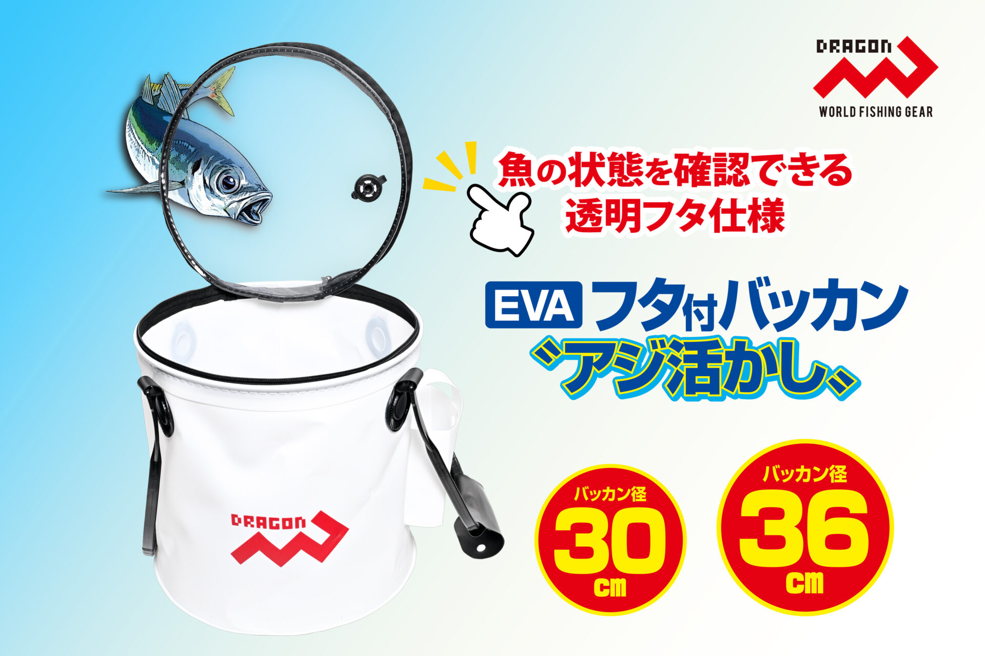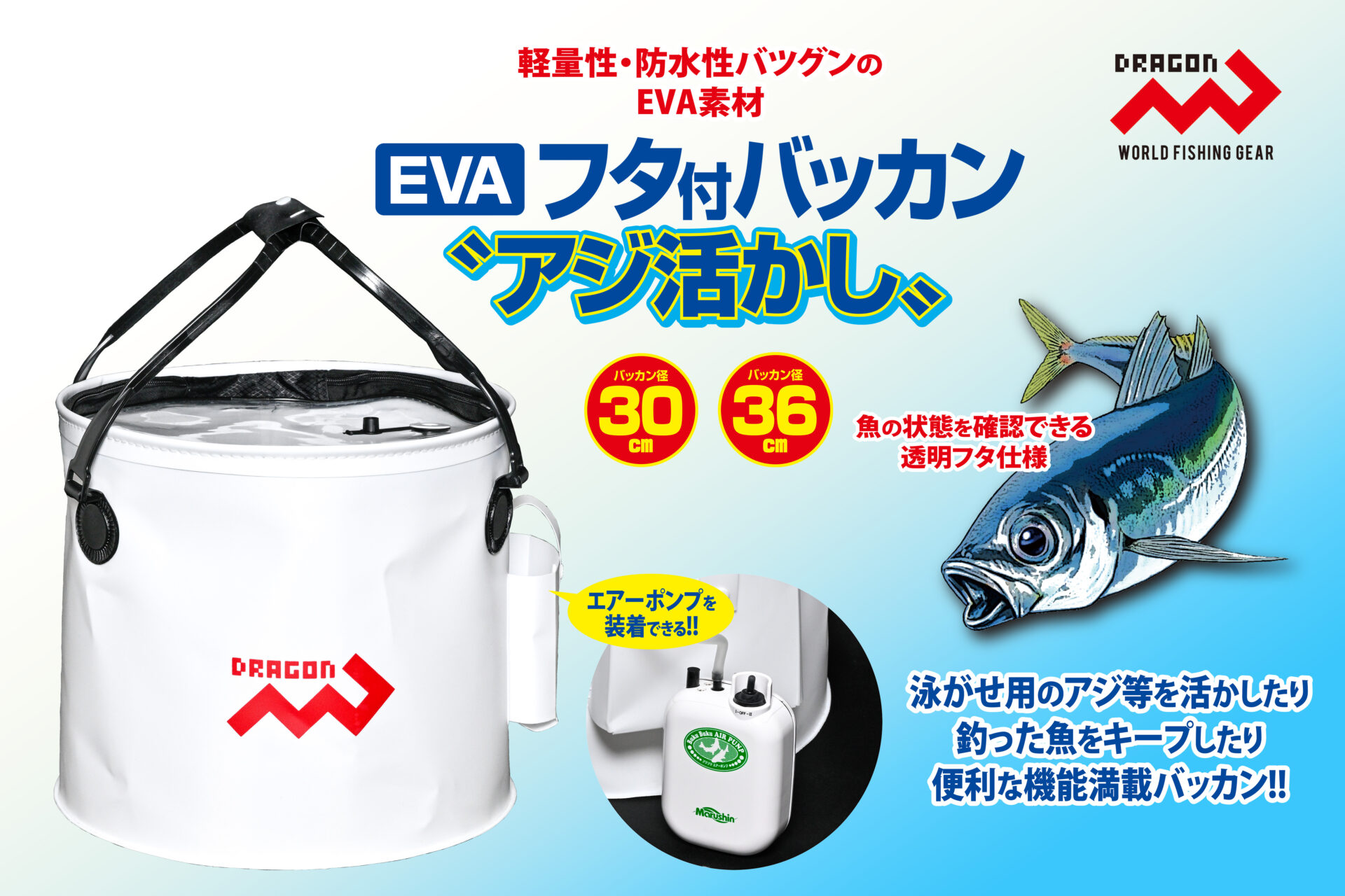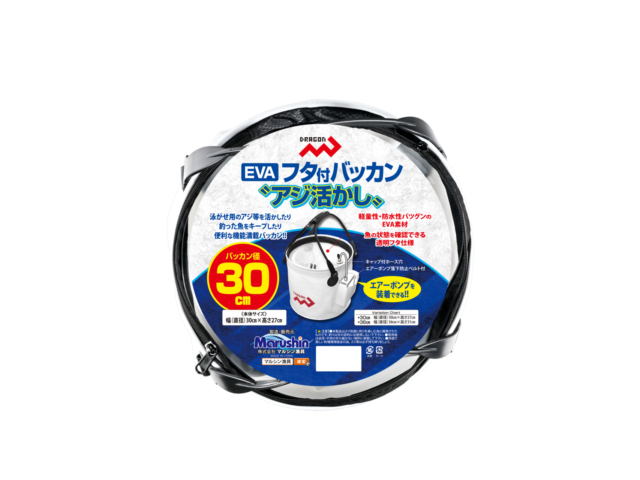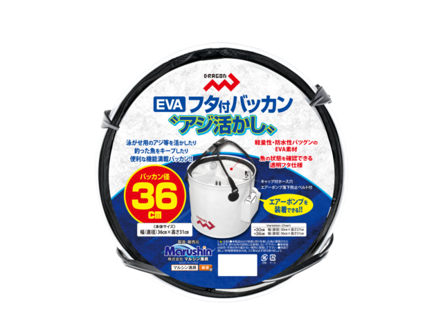 EVAフタ付バッカン”アジ活かし” / 30cm・36cm 網類・スカリ便利グッズ NEW!! おすすめ 泳がせ用のアジ等を活かしたり、釣った魚を新鮮キープ! 便利な機能満載の Dragon【EVAフタ付バッカン”アジ活かし”】 魚の状態を確認できる透明フタ仕様は、エアーポンプを装着すれば 泳がせ用のアジ等を活かしたり、釣った魚を鮮度良くキープしたり できる超便利なバッカンです。 透明フタやエアーポンプ用ポケットに加え、エアーポンプ用に設けた キャップ付ホース穴やエアーポンプ落下防止ベルト付など、”活かし” に特化した機能満載のDragon【EVAフタ付バッカン”アジ活かし”】は、 全国の釣具販売店様でご購入いただけます。 納期や販売価格のお問い合わせ、ご購入は「いつものお店」でお願い いたします。 ◯パッケージ寸法(約) 30cm 直径30cm 厚み10cm前後 GROSS WEIGHT 620g 36cm 直径36cm 厚み10cm前後 GROSS WEIGHT 710g◯小箱入数 ーJANコード商品名規格4535090181361EVAフタ付バッカン アジ活かし30cm4535090181378EVAフタ付バッカン アジ活かし36cm
