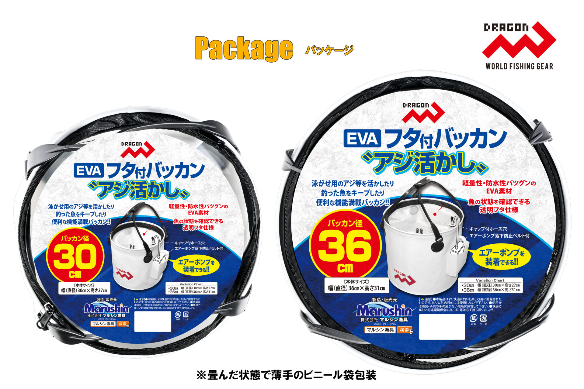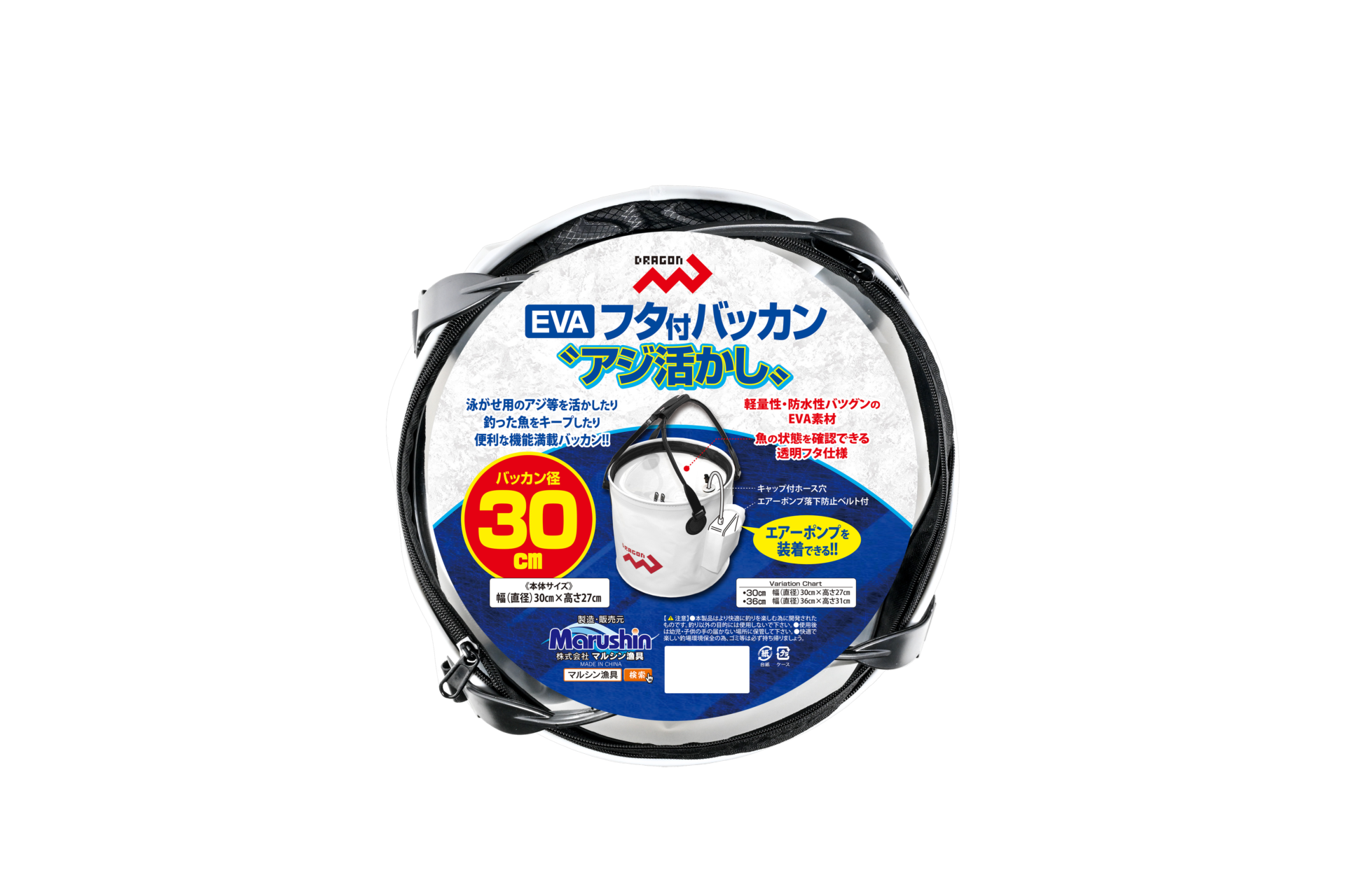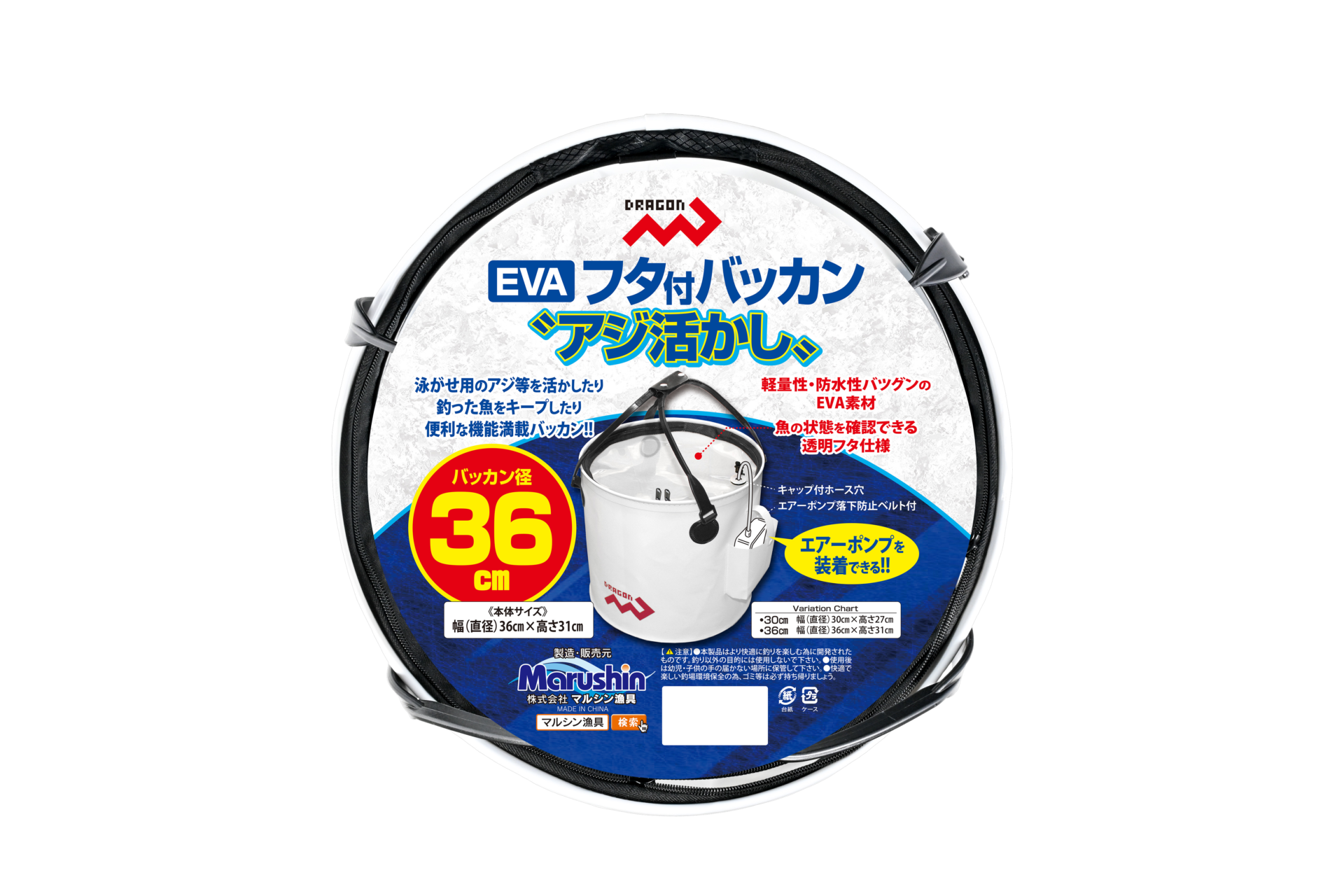 EVAフタ付バッカン”アジ活かし” / 30cm・36cm 網類・スカリ便利グッズ NEW!! おすすめ 泳がせ用のアジ等を活かしたり、釣った魚を新鮮キープ! 便利な機能満載の Dragon【EVAフタ付バッカン”アジ活かし”】 魚の状態を確認できる透明フタ仕様は、エアーポンプを装着すれば 泳がせ用のアジ等を活かしたり、釣った魚を鮮度良くキープしたり できる超便利なバッカンです。 透明フタやエアーポンプ用ポケットに加え、エアーポンプ用に設けた キャップ付ホース穴やエアーポンプ落下防止ベルト付など、”活かし” に特化した機能満載のDragon【EVAフタ付バッカン”アジ活かし”】は、 全国の釣具販売店様でご購入いただけます。 納期や販売価格のお問い合わせ、ご購入は「いつものお店」でお願い いたします。 ◯パッケージ寸法(約) 30cm 直径30cm 厚み10cm前後 GROSS WEIGHT 620g 36cm 直径36cm 厚み10cm前後 GROSS WEIGHT 710g◯小箱入数 ーJANコード商品名規格4535090181361EVAフタ付バッカン アジ活かし30cm4535090181378EVAフタ付バッカン アジ活かし36cm
